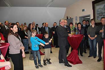 Vorstand Glashauser blickte in seiner Begrüßungsrede auf zwei erfolgreiche Feste im Jahr 2013 zurück. Die Sonnwendfeier im Juni und das Floriansfest im Juli waren sehr gut besucht. Vor allem zeigte er sich mit dem Verlauf des zweitägigen Floriansfestes mit 50 Jährigem Jubiläum der Fahnenweihe äußerst zufrieden. Hierzu wurde die Fahne Anfang des Jahres 2013 grundlegend renoviert. Man habe einen Spendenaufruf gestartet und möchte eine Ehrentafel mit den Namen der Spender im Feuerwehrhaus aufhängen. Wer spenden möchte, könne dies jederzeit gerne tun. Man überlege auch 2014 das Floriansfest an zwei Tagen und wieder mit einem ökumenischen Gottesdienst am Sonntag zu feiern. In der Jahreshauptversammlung Ende Februar soll darüber entschieden werden. Er schloss seine Begrüßungsrede mit einer Vision für das Jahr 2020. In diesem Jahr wird die Feuerwehr 125 Jahre, und das gilt es gebührend zu feiern.
